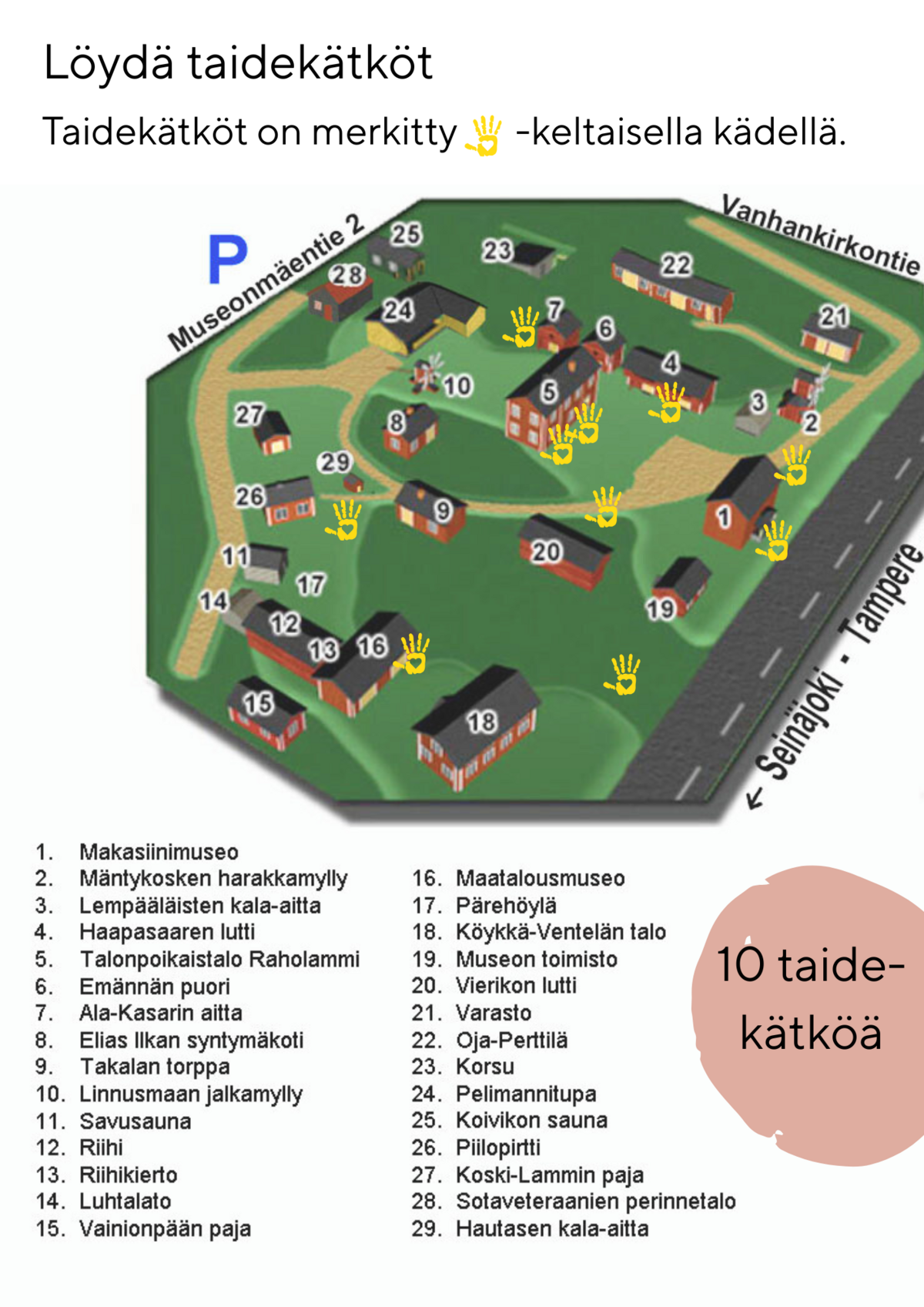 Taidekätköjä voi käydä omatoimisesti etsimässä Jalasjärven museon alueelta kesäisin.
